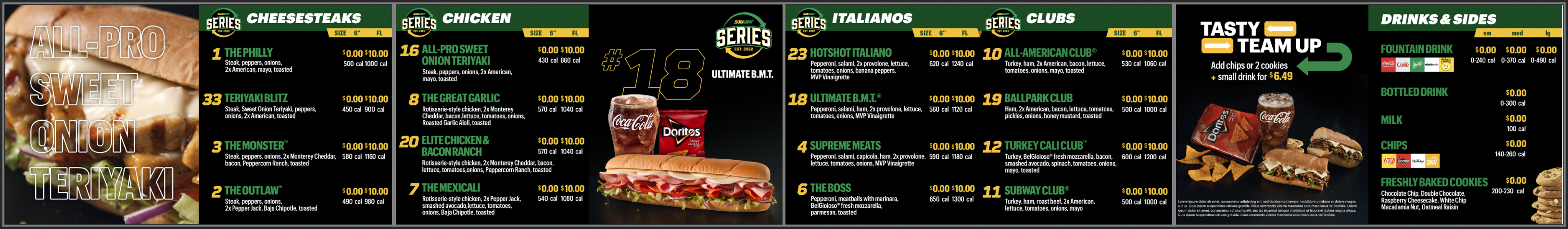 After unveiling an all new menu lineup, and trying to move away from the traditional sandwich customization experience to a more curated menu, I was tasked with developing a new menu style. This included deviation away from their traditional look and feel to a sleeker, darker look.